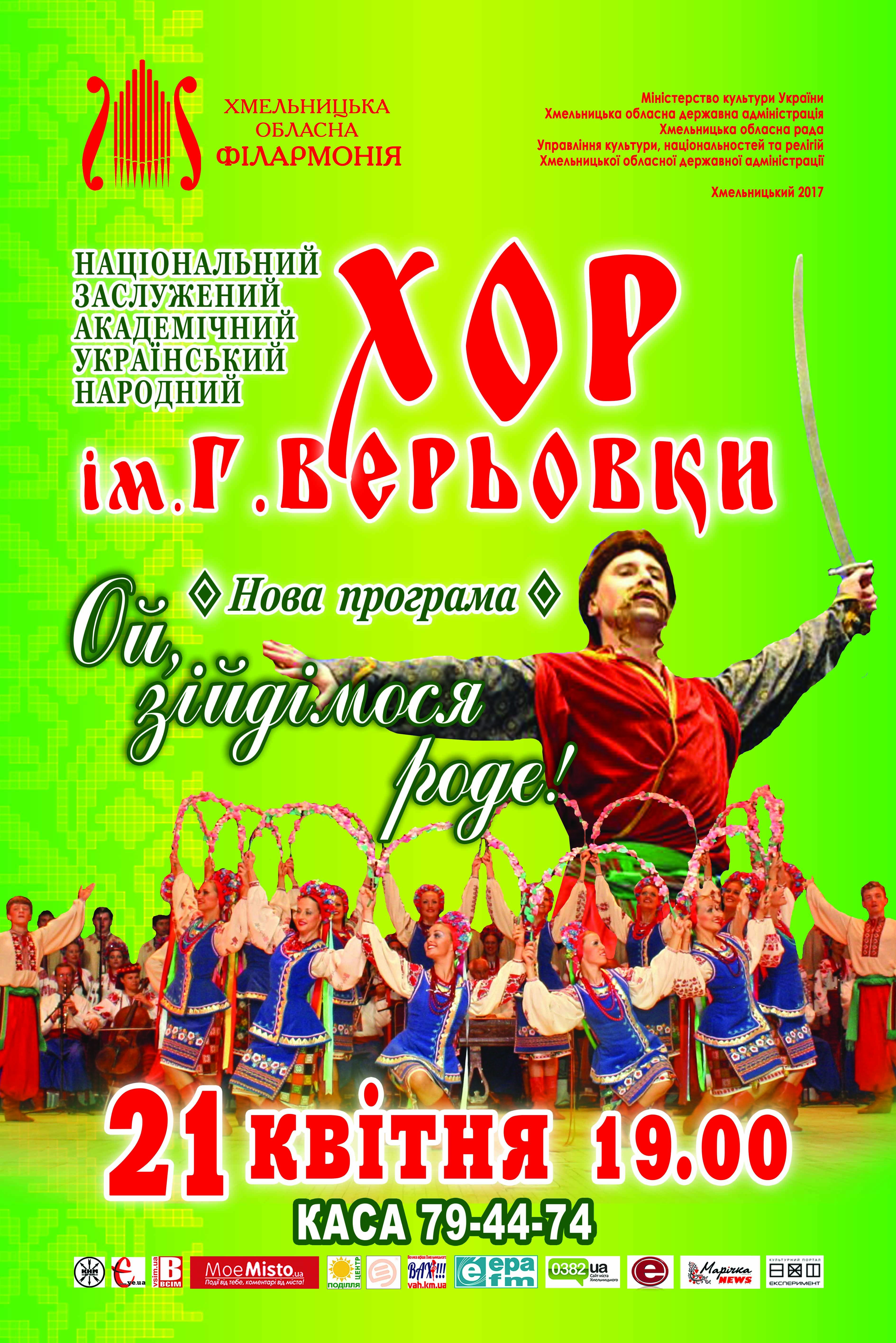 21 квітня 2017 року обласна філармонія запрошує усіх шанувальників українського народного мистецтва на зустріч з унікальним художнім колективом – Національним українським народним хором імені Григорія Верьовки.