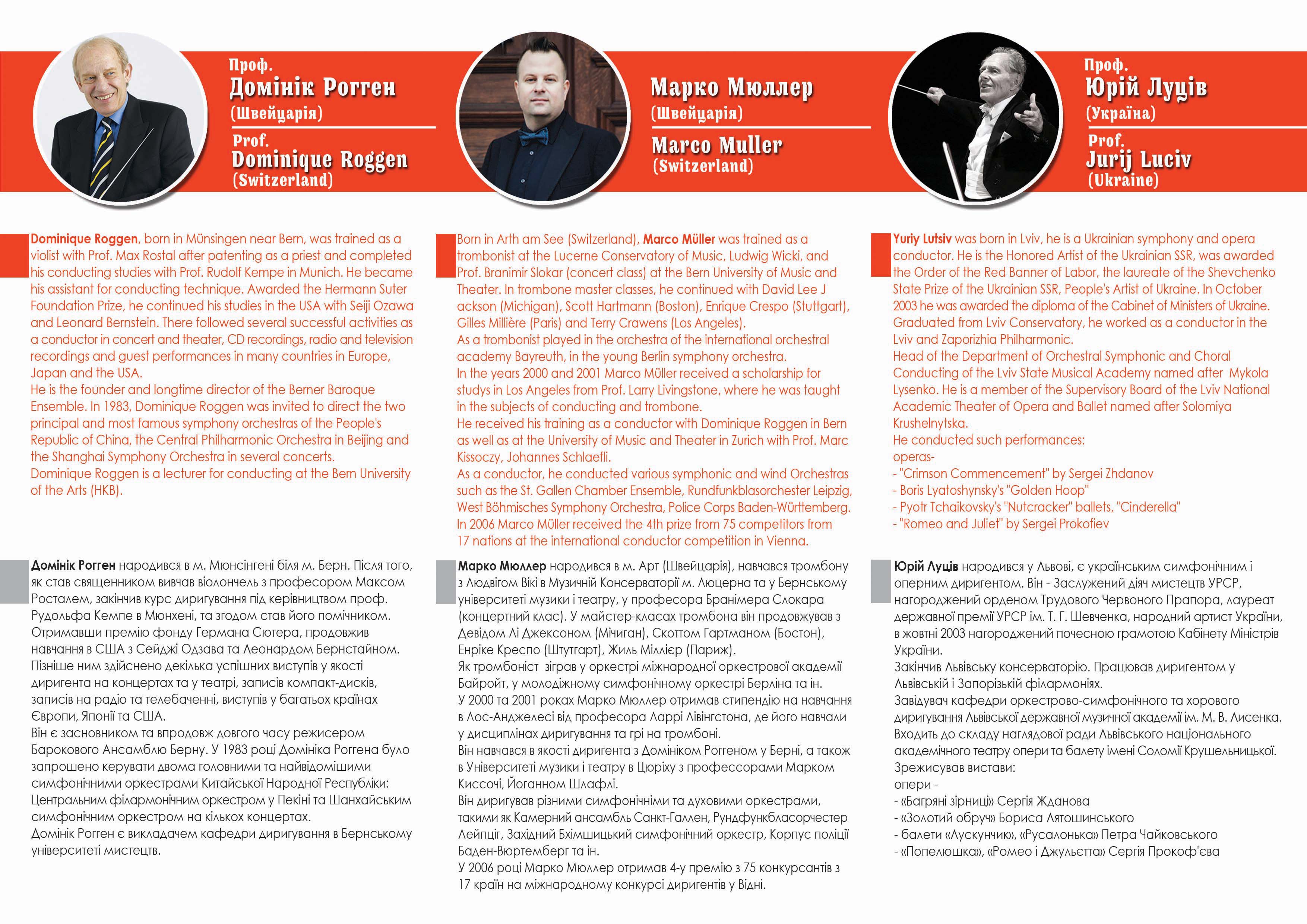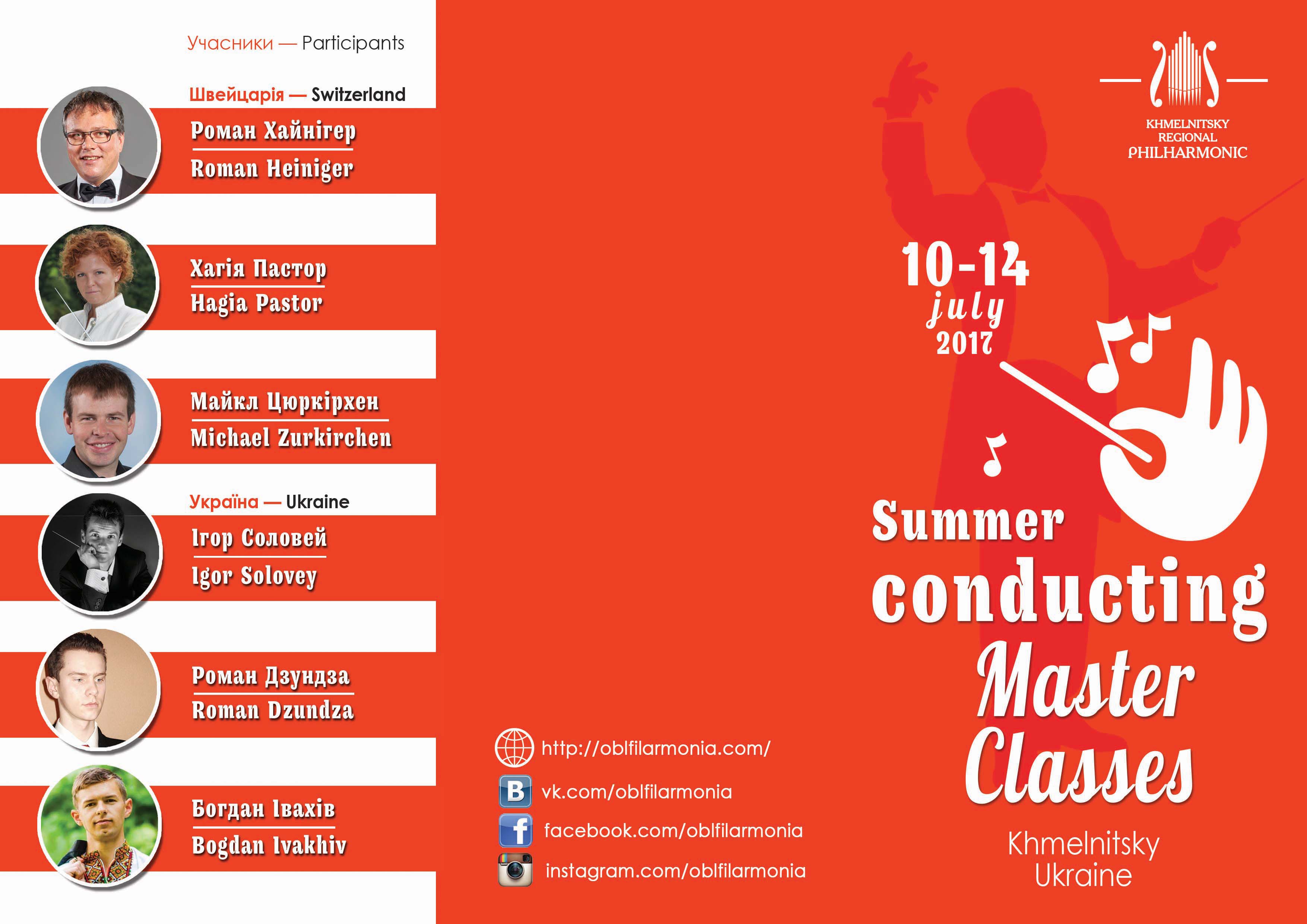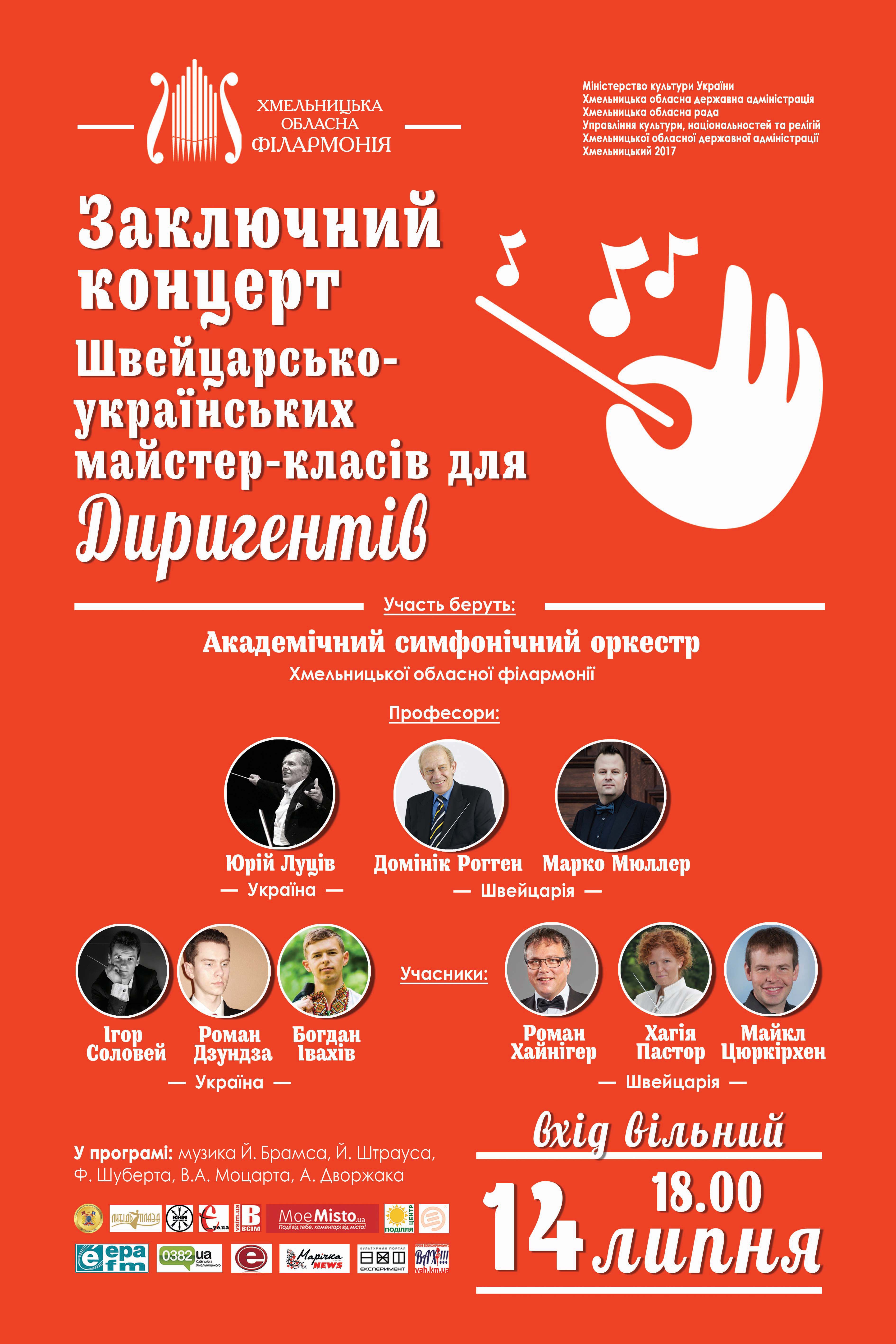 14 липня о 18.00 годині у великому залі обласної філармонії відбудеться заключний концерт літніх швейцарсько-українських майстер-класів для диригентів. У виконанні академічного симфонічного оркестру Хмельницької обласної філармонії (художній керівник та головний диригент — заслужений діяч мистецтв України Сергій Леонов) прозвучать твори Й. Брамса, Й. Штрауса, Ф. Шуберта, В. А. Моцарта, А. Дворжака. Диригують: Ігор Соловей, Роман Дзундза, Богдан Івахів (Україна), Роман Хайнігер, Хагія Пастор, Майкл Цюркірхен (Швейцарія). Під керівництвом проф. Юрія Луціва (Україна), проф. Домініка Роггена (Швейцарія) та Марко Мюллера (Швейцарія).