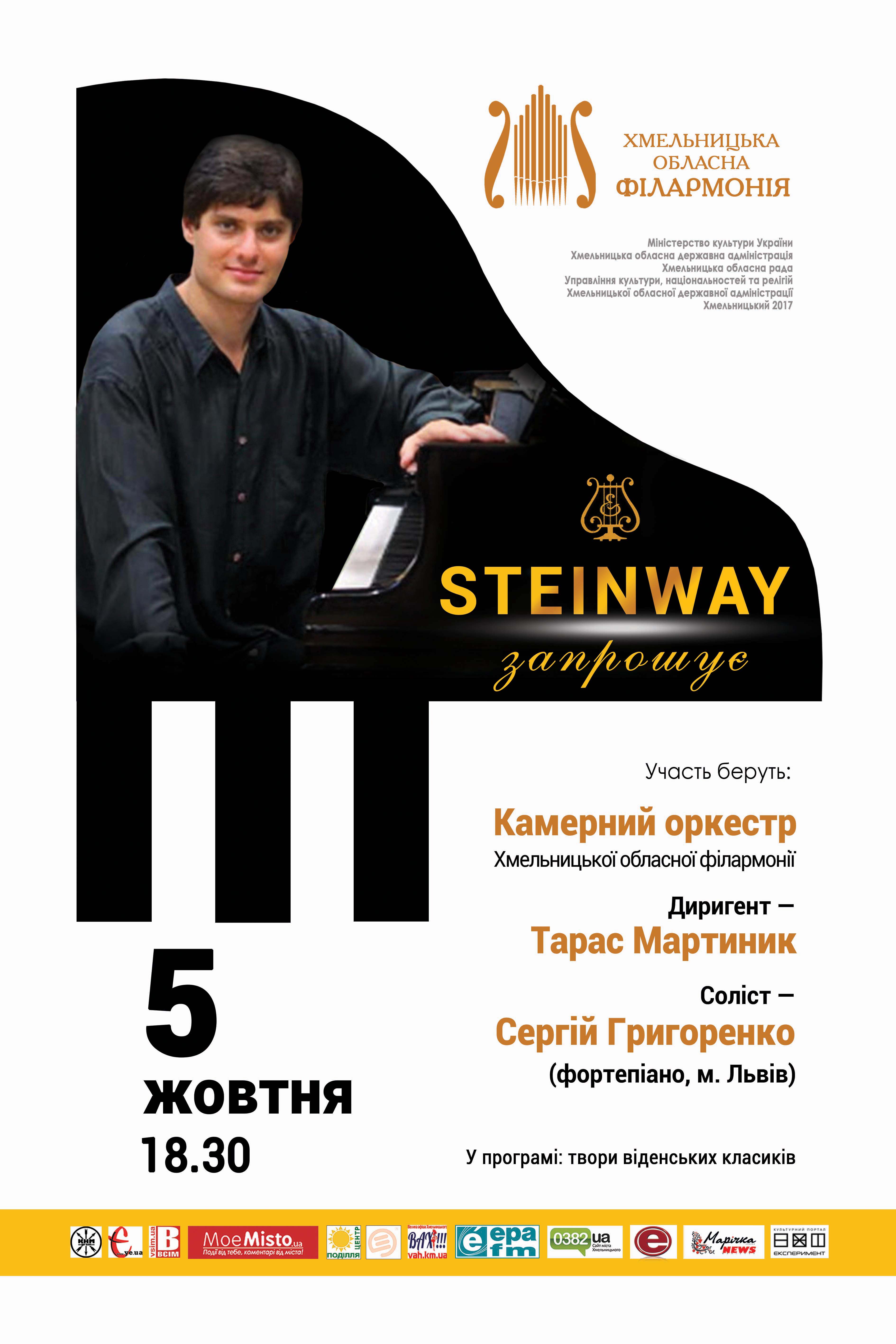 5 жовтня – концертна програма «STEINWAY запрошує» за участю Камерного оркестру Хмельницької обласної філармонії. Диригент — Тарас Мартиник. Соліст — Сергій Григоренко (фортепіано, м. Львів).  У програмі: твори віденських класиків.