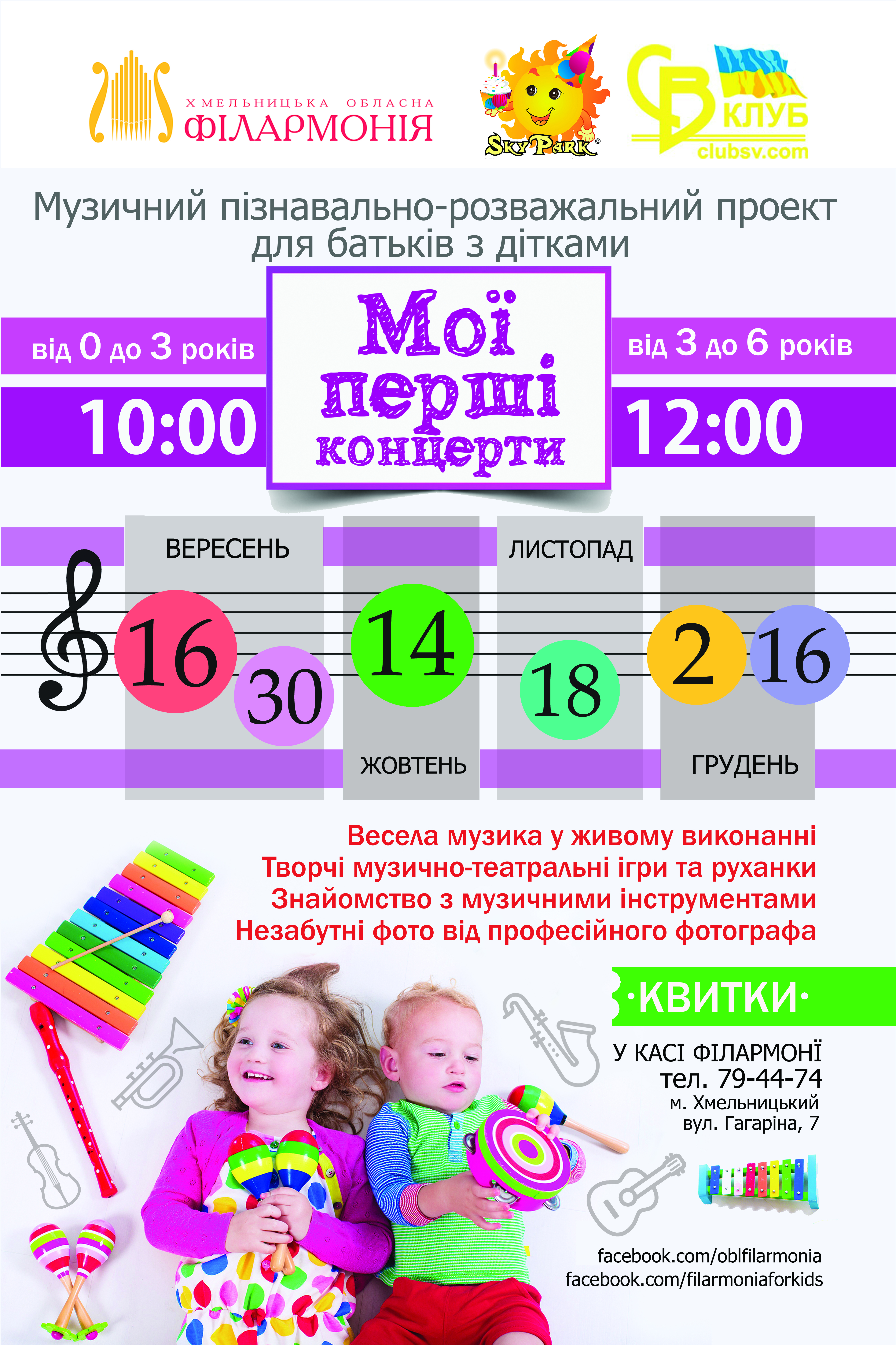 30 вересня – музичний пізнавально-розважальний проект для батьків з дітками від 0 до 6 років. На Вас чекає весела музика у живому виконанні, творчі музично-театральні ігри та руханки, знайомство з музичними інструментами, незабутні фото від професійного фотографа.