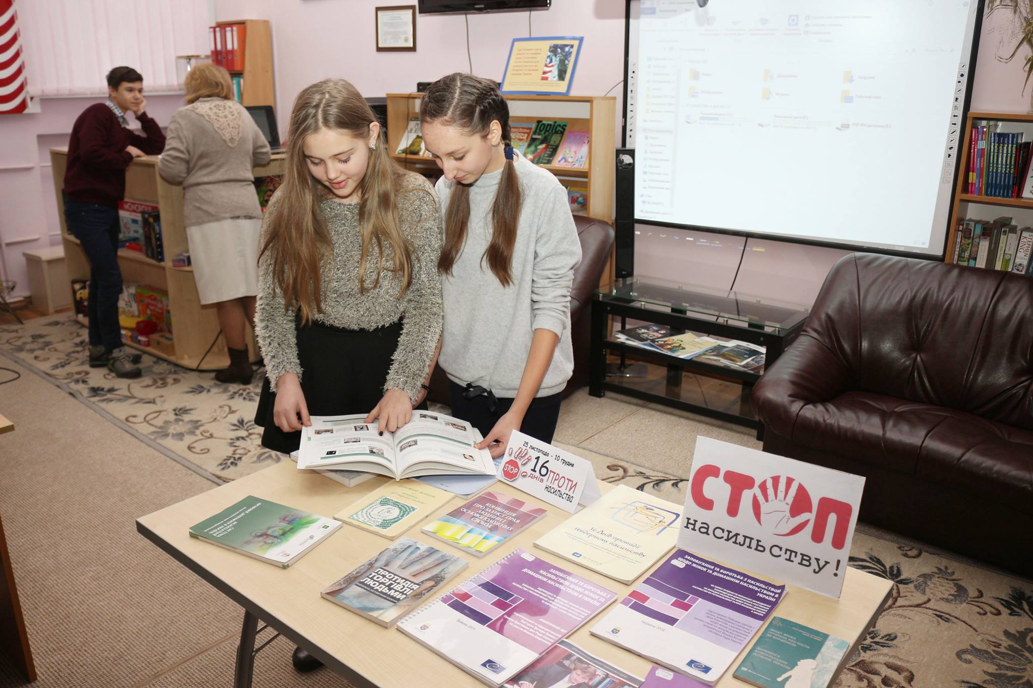 В рамках Всеукраїнської акції «16 днів проти насильства» у Хмельницькій ОУНБ відбулася бесіда «Світ без насильства» до Міжнародного дня боротьби за ліквідацію насильства щодо жінок. Практичний психолог Центру соціальних служб для сім’ї, дітей та молоді Антоніна Віговська привернула увагу молоді до актуальних для українського суспільства проблем подолання насильства в сім’ї та забезпечення рівних прав жінок і чоловіків. Під час заходу відбулася презентація книжкової виставки «Насильство: реалії сьогодення» та обговорення документального фільму «16 днів проти насилля».
