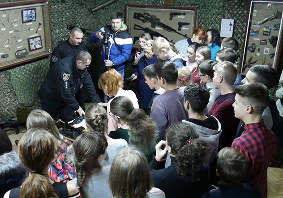 Окрім знайомства зі зброєю та спецзасобами, школярі мали змогу поспілкуватися з бійцями роти поліції особливого призначення, які вже четвертий рік безперервно несуть службу у зоні проведення антитерористичної операції.