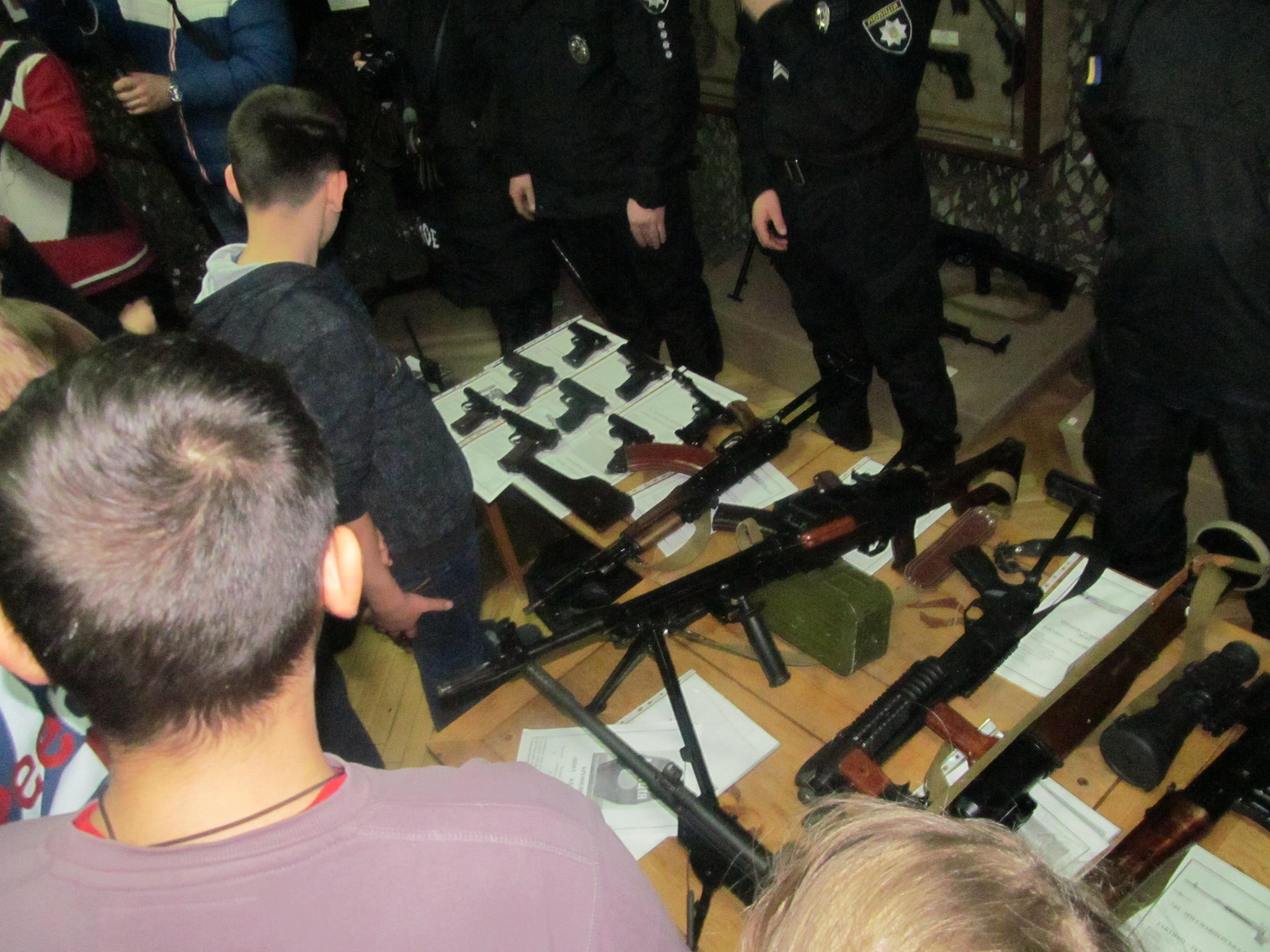 Бійці організували виставку зброї та спецзасобів. Не випадково захід відбувся в експозиційному залі «У полум’ї великої війни», адже тут представлено озброєння, яким наші предки захищали Батьківщину під час І та ІІ Світових воєн, а на виставці юні екскурсанти могли побачити зброю, якою бійці захищають нашу державу сьогодні.
