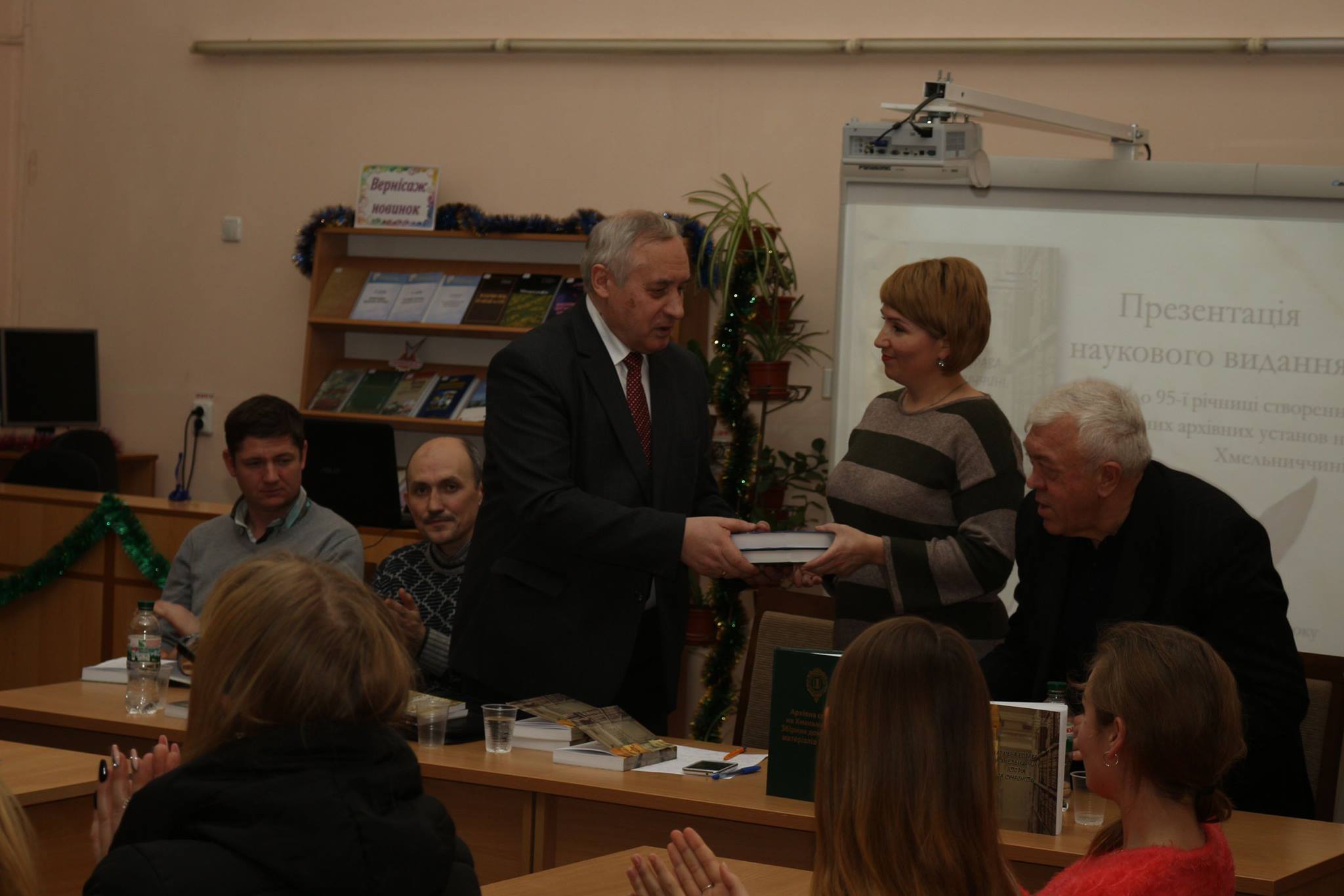 Учора в читальному залі гуманітарного профілю Хмельницької обласної універсальної наукової бібліотеки відбулась презентація наукового видання «», авторами якого є Володимир Байдич, Олександр Завальнюк, Олександр Комарніцький. Книга вийшла у серії “Праці Державного архіву Хмельницької області». Випуск 17 та присвячена 95-річчю створення архівних установ на Хмельниччині, архівістам різних поколінь (1922-2017рр.). Архівну спадщину представили: Завальнюк О.М., доктор історичних наук, професор Кам’янець-Подільського університету ім. І. Огієнка; Байдич В.Г., кандидат історичних наук, директор Державного архіву Хмельницької області; Олійник Ю.В., кандидат історичних наук, начальник відділу інформаційних технологій Державного архіву Хмельницької області; Віталій Галатир, кандидат історичних наук, головний науковий співробітник відділу інформаційних технологій Державного архіву Хмельницької області; Блажевич Ю.І., кандидат історичних наук, голова міської організації Національної спілки краєзнавців України. Перед присітніми виступали: Адамський В.Р., Захар’єв Володимир, Кузіна Б.С. та ін. Висловлюємо щиру подяку авторам за подаровані бібліотеці наукові праці та вітаємо з прийдешнім Днем архівіста.