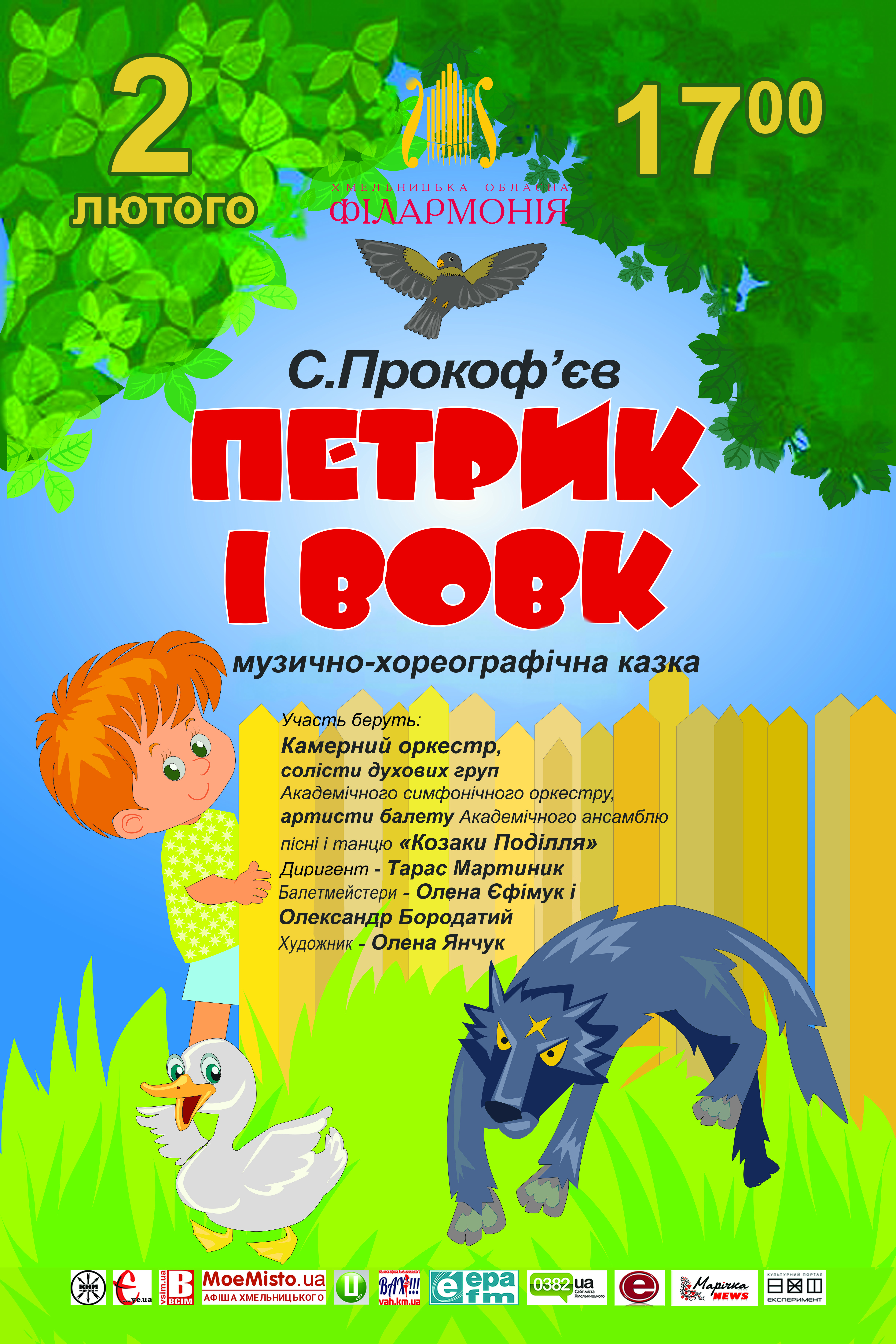Запрошуємо на музично-хореографічну виставу для дітей, казку Сергія Прокоф’єва «Петрик і вовк», що легко допоможе маленьким слухачам відкрити світ великої симфонічної музики! Повчальна розповідь про сміливого хлопчака Петрика, який за допомогою Пташки зумів перехитрувати і провчити Вовка – це одна з найвідоміших у світі дитячих музичних історій. Казкові образи тут «говорять» голосами відповідних музичних інструментів та мовою танцю.