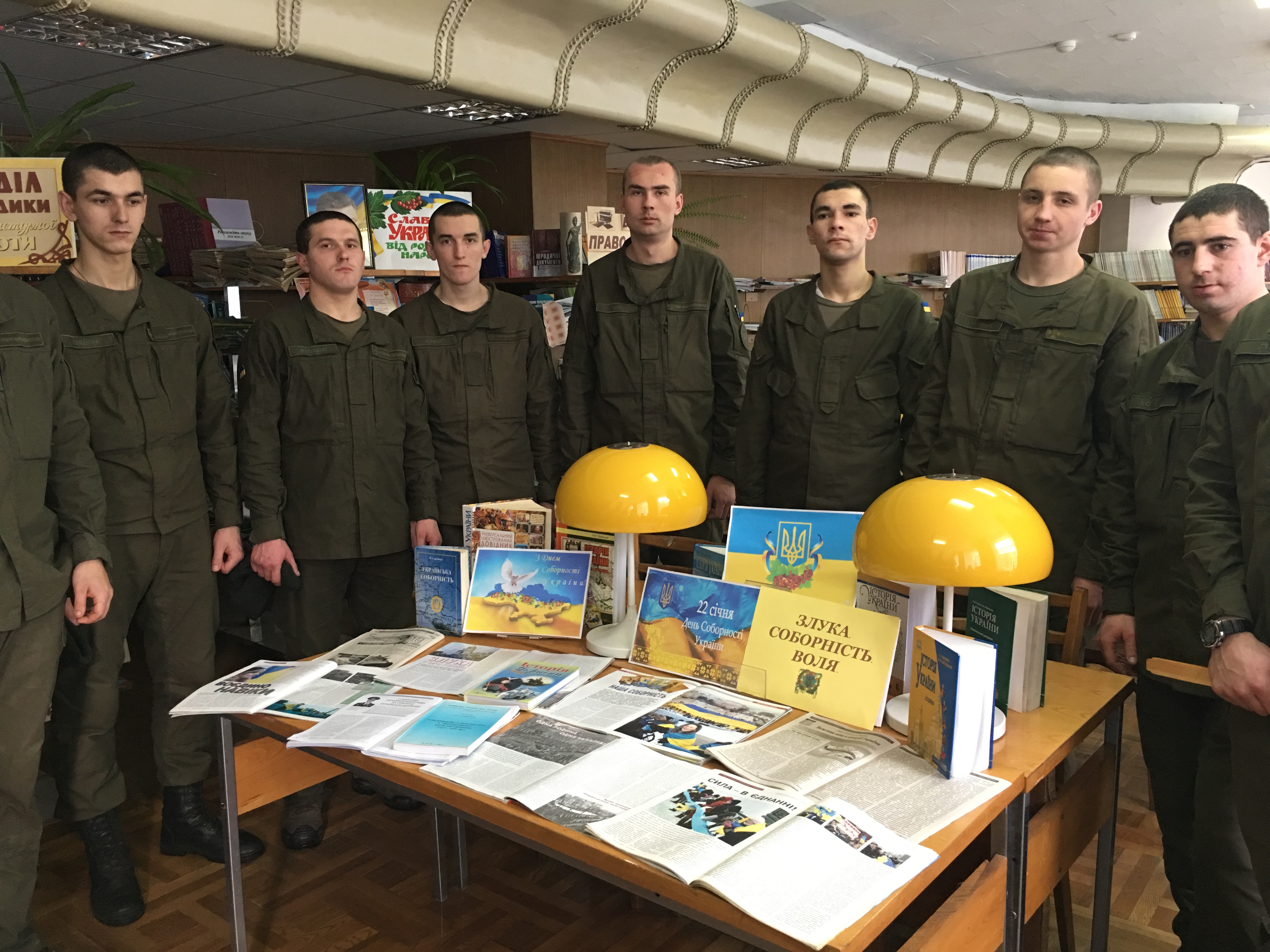 22 січня знаменній події був присвячений історичний хронограф  «Від історичної Злуки до омріяної злагоди», на який запрошено військовослужбовців Хмельницького батальйону Національної гвардії України. Розповідь бібліотекаря про події майже 100-річної давнини доповнили  відеофільм «Соборна Україна»  та слайд – презентація «Злука – омріяна поколіннями», один із розділів якої розповідає про сучасну історію України –  події  в зоні АТО.    Читачам  була   представлена  книжкова експозиція – «Злука. Соборність. Воля», на якій розкрито книги та матеріали періодичних видань, світлини, документи, що висвітлюють період діяльності ЗУНР та УНР,  віхи об’єднавчого руху, який наприкінці 1918 та початку 1919 року охопив всю Україну.