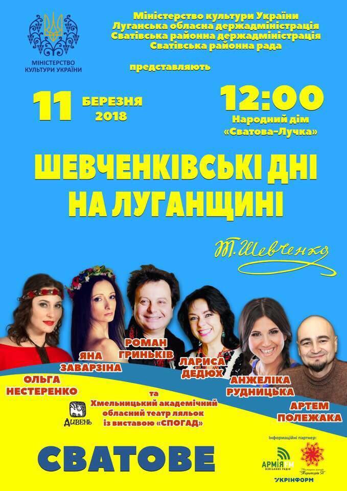 В рамках загального Українського проекту культурної інтеграції “Український схід”, затвердженого наказом Міністерства культури України, Хмельницький академічний обласний театр ляльок з 9 по 12 березня 2018 року взяв участь у мистецькій акції “Шевченківські дні” у Сватівському районі Луганської області. Виставу ” Т.Г.Шевченко. Спогад”, що стала лауреатом обласної премії імені Т.Шевченка, в переповнених залах переглянули глядачі сіл Свистунівка, Коломийчиха та міста Сватово.