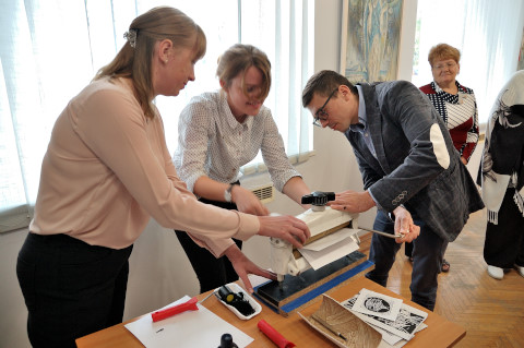 Про сучасні форми роботи розповіли колегам співробітники Хмельницького обласного художнього музею, запросивши на оглядову екскурсію з елементами майстер-класів. Усі присутні у виставковій залі, де нині експонуються роботи Заслуженого художника України Бориса Негоди, змогли попрактикуватися у виготовленні ліногравюр. Надихнувшись ненаративним мистецтвом, учасники семінару в іншому залі мали змогу створити власні абстрактні мистецькі твори.