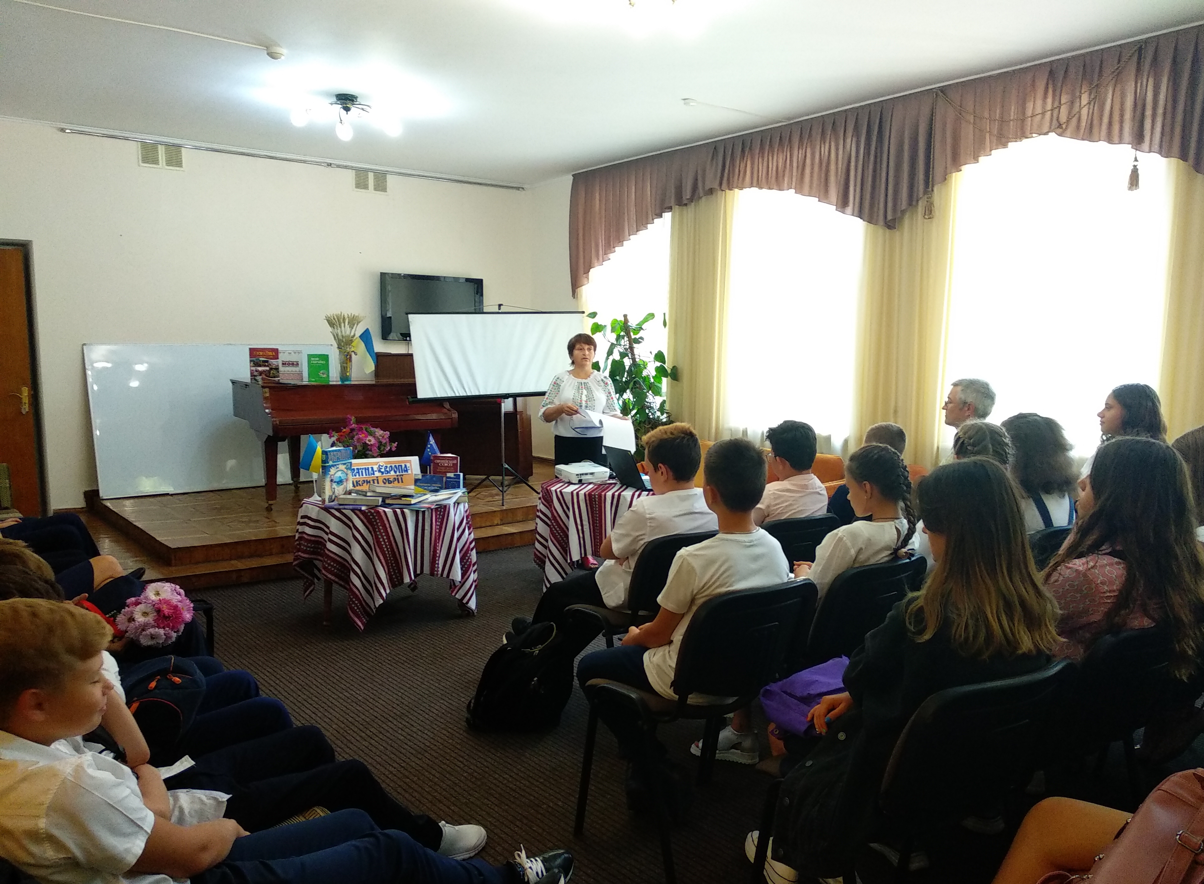 Бібліотекарі запросили на перший урок старшокласників міста, а  до деяких в класи і  самі завітали. Теми першого уроку в новому навчальному році  «Відкрий  для себе  Україну, відкрий себе для України»  та «Вивчаємо Європу – змінюємо Україну» готувались  фахівцями відділів обслуговування ретельно і розкривались креативно. Учасниками бібліотечного першого уроку стали  учні ліцею №17 та СЗОШ №8.   Старшокласники разом бібліотекарями  поринули в історичне минуле нашої країни, дізналися більше про видатних людей України, насолодилися красою та неповторністю природи рідного краю, поезією та музикою. Учні з’ясували, що  міжнародний імідж держави творять політики та спортсмени, актори і науковці.  Бібліотекарі  запропонували  добірку найрезонансніших досягнень у сфері української науки, техніки, медицини. Особливий акцент зроблено на талановиту молодь, яка прославляє Україну своїми винаходами, мистецтвом, перемогами в спорті. Згадали й про освітній хайп «Відкривай Україну», у якому брала участь і команда ліцею №17.   Зрештою учні дійшли до одного логічного висновку: бажаєш жити в успішній і процвітаючій державі – докладай зусиль для того, щоб збудувати таку державу.     Молодь активно  брала участь у вікторинах  «Постать в історії» та  «Україна статистична», у грі «Галерея образів»,  інтерактивній грі «Моє слово про Україну»,  під час якої складали асоціативний кущ до слова «Україна» та вікторині «Чи знаєте ви Україну?»,    віртуально подорожували країнами Європи, відкрили для себе багато нового і цікавого про європейську освіту та освітні програми,     перевірили свої знання,  взявши участь у євро вікторині, руханці-енерджайзері «Друкарська машинка». Цікавим  доповненням уроків були презентації та відеоролики.IMG_20190902_091553 IMG-d5d6ee97ca1c5a08b12550434b4f381a-V