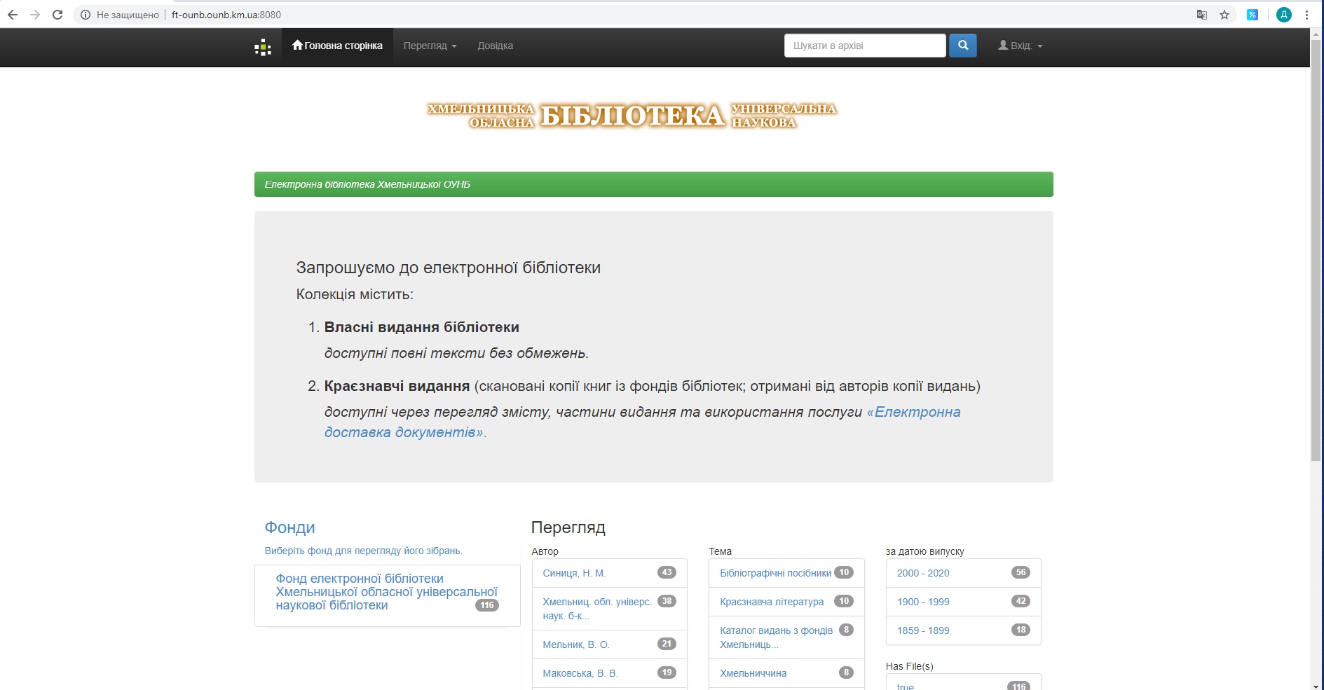 Фонд бібліотеки складають копії власних видань бібліотеки, копії видань, подарованих правовласниками, скан-копії раритетних краєзнавчих видань з фондів бібліотеки. Розміщення ресурсу на платформі DSpace дає можливість багатоаспектного пошуку за назвою видання, авторами, роком видання, в окремих колекціях.