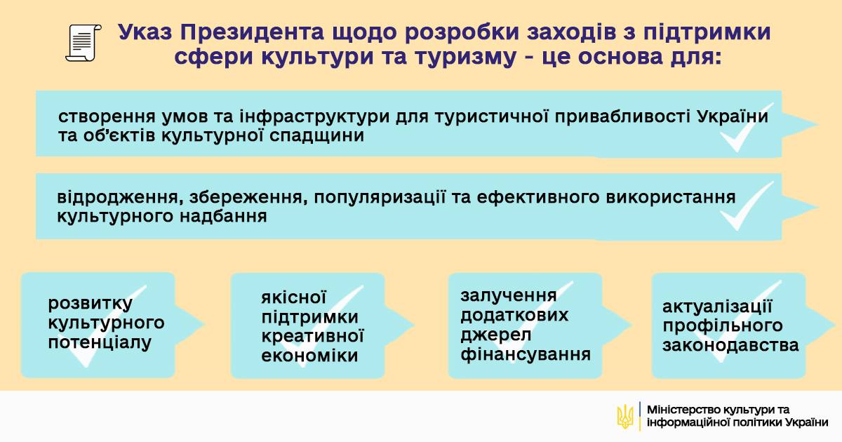 Документ має на меті сприяння розвитку культурного потенціалу України, збереження, популяризації та ефективного використання національного культурного надбання, створення умов для туристичної привабливості об’єктів культурної спадщини, підтримки креативної економіки.