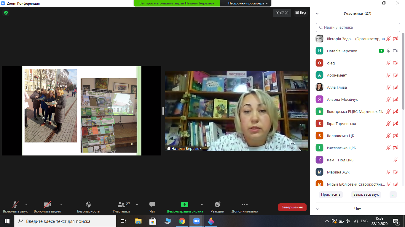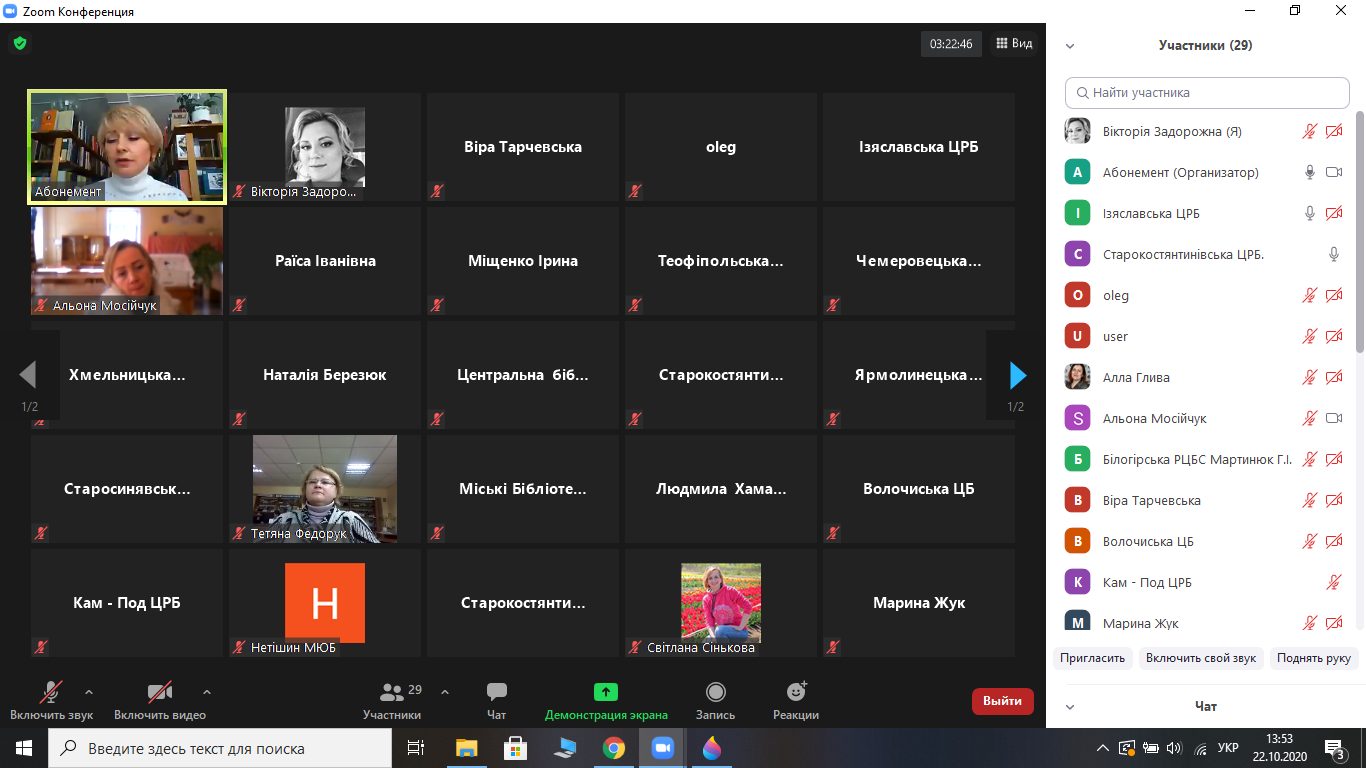 Обласною бібліотекою для юнацтва  та обласним науково-методичним центром культури і мистецтва 22 жовтня 2020 року проведено  онлайн-навчання бібліотекарів публічних бібліотек області, що відповідають за роботу  з юнацтвом на тему « Організація бібліотечного обслуговування юнацтва в умовах децентралізації». Навчання проходило на технологічній платформі Zoom. Зареєстровано для участі 27 бібліотекарів з  різних публічних бібліотек області, фактично брали участь в навчанні 29 фахівців. Впродовж 6-и годин роботи провідні фахівці обласної бібліотеки для юнацтва розкрили учасникам актуальні теми бібліотечного обслуговування молоді   в сучасних умова, а саме: сучасні тенденції та пріоритети публічних бібліотек в обслуговуванні молоді та юнацтва ; трансформація бібліотек в центри місцевої активності; інноваційні бібліотечні практики та форми комунікації з молодим користувачем; оновлення інформаційно-бібліотечних послуг в умовах впровадження сучасних технологій;    популяризація  книги та читання в молодіжній читацькій аудиторії:нестандартні форми та методи ;   що читати сучасному тінейджеру?: аналітичний огляд  сучасної підліткової літератури;   бібліотека – платформа  для розвитку творчих здібностей молодої особистості ; бібліотечні  екологічні проекти: актуально для громади;  робота бібліотек  з правового  та патріотичного виховання:традиції та новації ;      бібліотечні  послуги та заходи для молоді в онлайн-форматі: з практики роботи бібліотеки  під час карантину.  Онлайн- спілкування відбувалося у форматі презентацій, тренінгів, професійних діалогів, консультацій тощо.