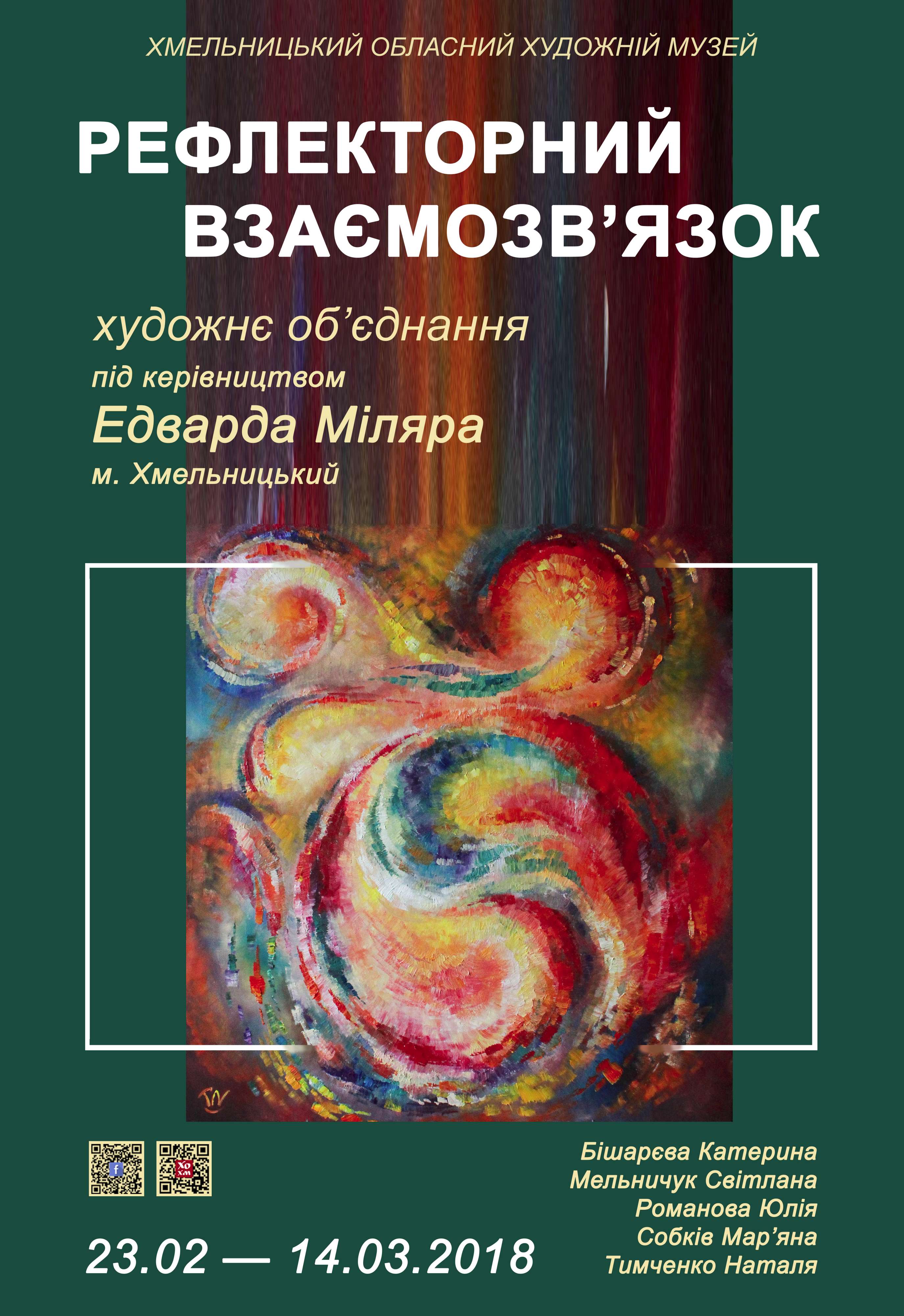 23 лютого о 16.00 годині у приміщенні Хмельницького обласного художнього музею відбудеться відкриття виставки живопису художнього об’єднання «Рефлекторний взаємозв’язок» (Бішарєва Катерина, Мельничук Світлана, Романова Юлія, Собків Мар’яна, Тимченко Наталя), м.Хмельницький.  Художниці працюють під керівництвом члена Національної спілки художників України – Едварда Міляра.
