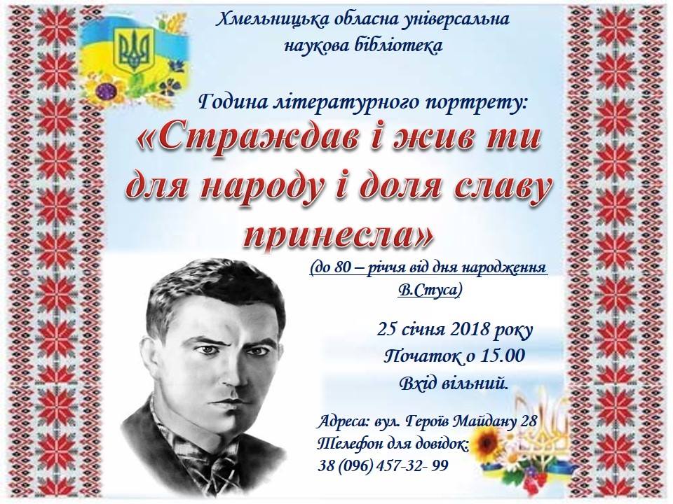 Щорічно  у січневі дні український народ вшановує творчу і подвижницьку діяльність Василя Стуса. З нагоди 80-річчя від дня народження  цього великого українського поета і патріота 25 січня  у Хмельницькій ОУНБ  відбудеться година літературного портрета «Страждав і жив… Продовження