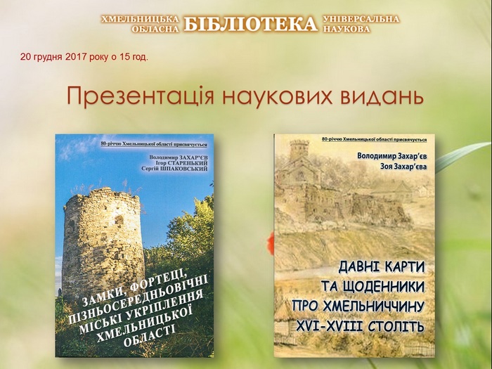 20 грудня 2017 року у Хмельницькій  обласній універсальній науковій бібліотеці відбудеться презентація наукових видань: “Замки, фортеці, пізньосередньовічні укріплення Хмельницької області» (автори: Володимир Захар’єв, Ігор Старенький, Сергій Шпаковський) і «Давні карти та щоденники про Хмельниччину XVI-XVII століть» Першу книгу Володимир Захар’єв… Продовження