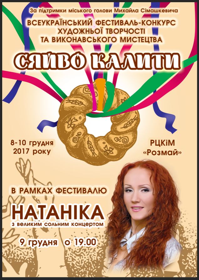8-10 грудня у концертному залі районного центру культури і мистецтва «Розмай» відбудеться І Всеукраїнський фестиваль-конкурс художньої творчості та виконавського мистецтва «СЯЙВО КАЛИТИ». Конкурсна програма для дітей та молоді проводиться у номінаціях: хореографія, вокал, інструментальне мистецтво, театральне мистецтво, оригінальний жанр, фольклор, образотворче та декоративно-прикладне мистецтво.