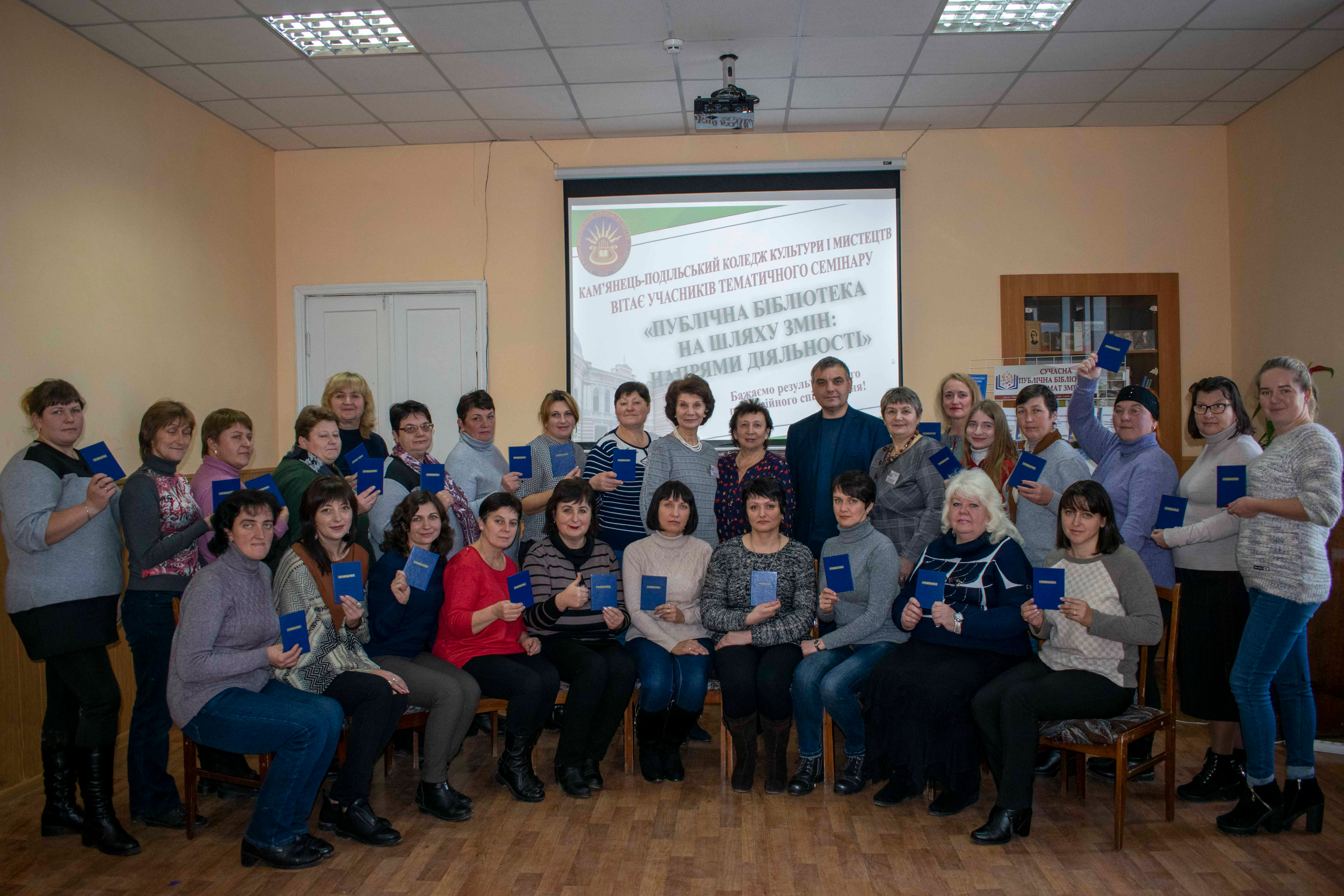 20-22 листопада 2019 року на базі Кам’янець-Подільського коледжу культури і мистецтв у рамках підвищення кваліфікації бібліотечних працівників області відбувся тематичний семінар «Публічна бібліотека на шляху змін: напрями діяльності». Учасники семінару – 29 фахівців бібліотечних установ об’єднаних територіальних громад, ЦБС, бібліотек навчальних закладів. Діяльність навчального закладу презентував директор коледжу Нижник С.… Продовження
