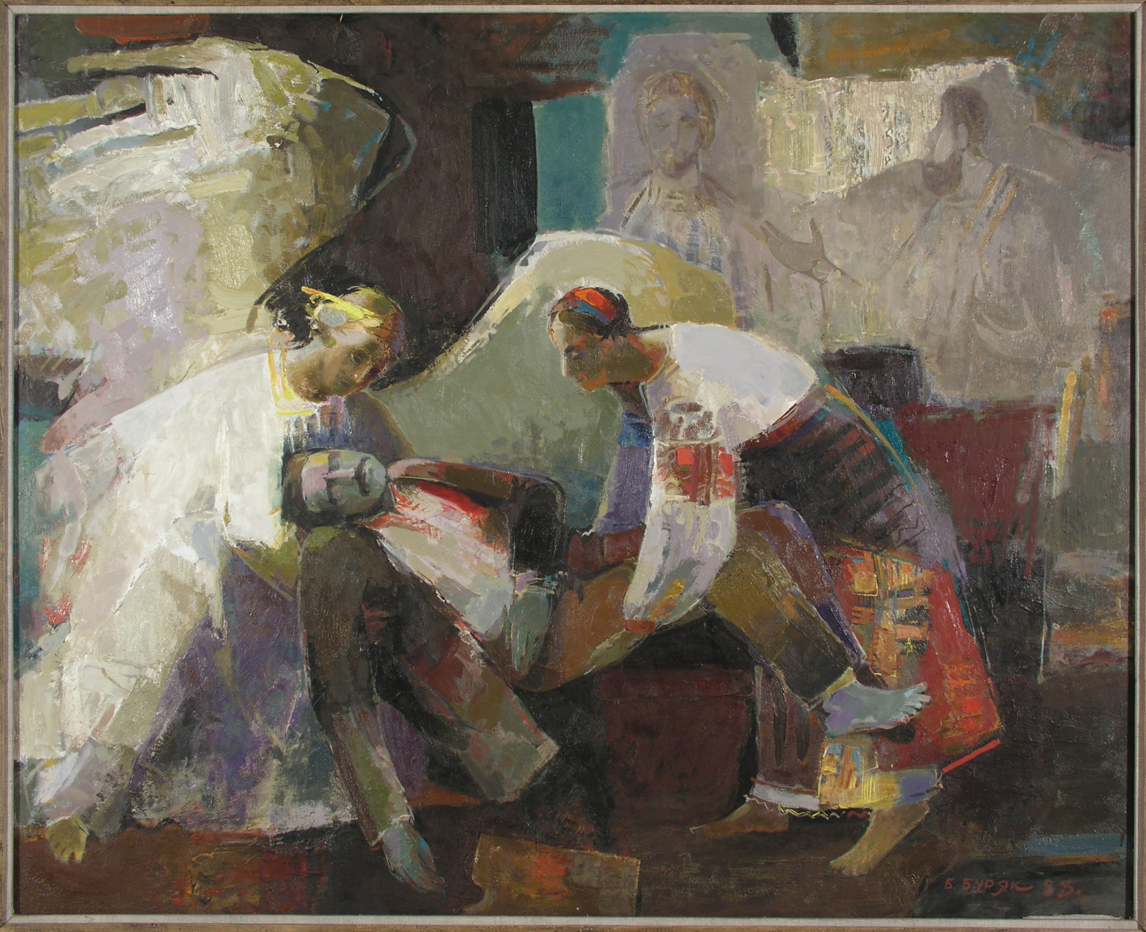 В експозиції поряд із роботами безпосередніх учнів професора Михайла Бойчука, а це Оксана Павленко, Онуфрій Бізюков, Степан Данилишин, Олександр Саєнко, Леонід Хижинський, та учні Івана Падалки… Продовження